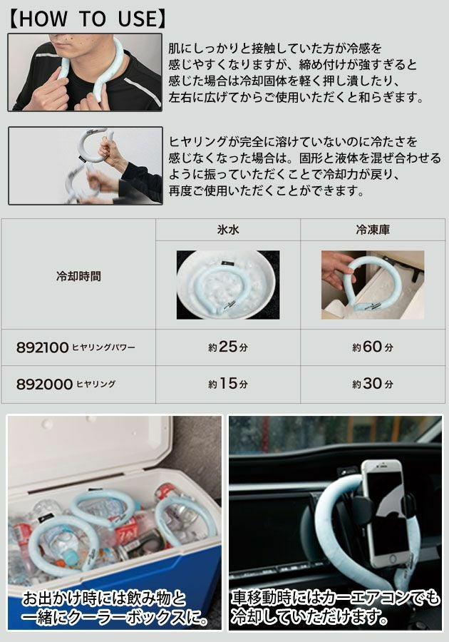 | 特徴 | 首元から涼しく、体が冷えすぎない。 長時間タイプのヒヤリングパワーが新登場! NASAが宇宙飛行士を急激な温度変化から守るために開発された P.C.M冷却素材を使用した冷感アップリング。 22℃以下の気温や水で冷却固体化するので、どこでも手軽に何度でもクールアイテムとして使用できます。 冷却素材は安心・安全の植物性なので、万が一液漏れして肌に触れても荒れにくくなっています。 また、環境にも配慮されているので廃棄の際も安全です。 周囲の温度が上昇しても一定の温度帯を維持し熱を吸収します。 急激な温度変化による結露も起きず、冷えすぎることがないので 敏感肌の方、女性やお子様でも安心してご使用いただけます。 ・繰り返し使えて経済的 ・一年中使える ・熱中症対策、発熱時、勉強中、デスクワーク、スポーツのクールダウンなど使用場面は多岐にわたります ・Sサイズはレディース、キッズ対応 ・リバーシブルデザイン ◆ご使用時間目安 約3.5時間(外気温25~35度の場合) ※時間は目安です、ご使用環境や気温、製品の液体温度により異なります。 <冷却時間> ・氷水:約25分 ・冷凍庫:約60分 【ご使用方法】 ・肌にしっかりと接触していた方が冷感を感じやすくなりますが、締め付けが強すぎると感じる場合は 冷却固体を軽く押し潰したり、左右に広げてからご使用いただくと和らぎます。 ・ヒヤリングが完全に溶けていないのに冷たさを感じなくなった場合は、固形と液体を混ぜ合わせるように 振っていただくことで冷却力が戻り、再度ご使用いただくことができます。 ・お出かけ時には飲み物と一緒にクーラーボックスに、車移動時にはカーエアコンでも冷却していただけます。 |