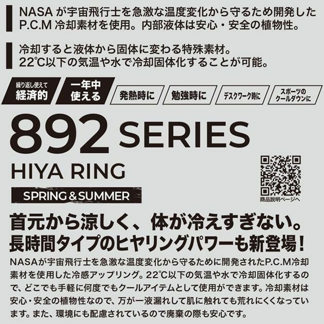 | 特徴 | 首元から涼しく、体が冷えすぎない。 長時間タイプのヒヤリングパワーが新登場! NASAが宇宙飛行士を急激な温度変化から守るために開発された P.C.M冷却素材を使用した冷感アップリング。 22℃以下の気温や水で冷却固体化するので、どこでも手軽に何度でもクールアイテムとして使用できます。 冷却素材は安心・安全の植物性なので、万が一液漏れして肌に触れても荒れにくくなっています。 また、環境にも配慮されているので廃棄の際も安全です。 周囲の温度が上昇しても一定の温度帯を維持し熱を吸収します。 急激な温度変化による結露も起きず、冷えすぎることがないので 敏感肌の方、女性やお子様でも安心してご使用いただけます。 ・繰り返し使えて経済的 ・一年中使える ・根中小対策、発熱時、勉強中、デスクワーク、スポーツのクールダウンなど使用場面は多岐にわたります ・Sサイズはレディース、キッズ対応 ・リバーシブルデザイン ◆ご使用時間目安 約3.5時間(外気温25~35度の場合) ※時間は目安です、ご使用環境や気温、製品の液体温度により異なります。 <冷却時間> ・氷水:約15分 ・冷凍庫:約30分 【ご使用方法】 ・肌にしっかりと接触していた方が冷感を感じやすくなりますが、締め付けが強すぎると感じる場合は 冷却固体を軽く押し潰したり、左右に広げてからご使用いただくと和らぎます。 ・ヒヤリングが完全に溶けていないのに冷たさを感じなくなった場合は、固形と液体を混ぜ合わせるように 振っていただくことで冷却力が戻り、再度ご使用いただくことができます。 ・お出かけ時には飲み物と一緒にクーラーボックスに、車移動時にはカーエアコンでも冷却していただけます。 |