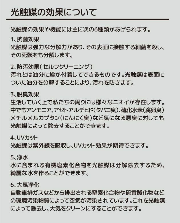 | 特徴 | 高濃度光触媒に銀イオンと銅イオンをプラス! トリプル効果で瞬間除菌! さらに除菌効果が続く! ◆新時代のウイルスコーティング!光触媒技術採用! 光触媒は太陽や蛍光灯などの光が当たると、その表面で強力な酸化力が生まれ、接触してくる最近などの有害物質を除去することができます。 原料である酸化チタンは塗料から日焼け止め、歯磨き粉まで使用されている安全で無害な成分です。 内視鏡化カテーテルなど医療器具にも使用されている安全な物質を採用しています! ◆光触媒6つの効果! 菌やウイルスを除菌するだけじゃない! 6つの効果や機能があります。 ・抗菌効果 ・防汚効果 ・脱臭効果 ・UVカット ・浄水効果 ・大気浄化 ◆使い方 自宅やオフィスの除菌・抗菌に。 衣類やカバンなど身につけるものにスプレーすることも可能です! さらにお店や飲食店の除菌対策にもぴったりです! ◆内容量:200ml |