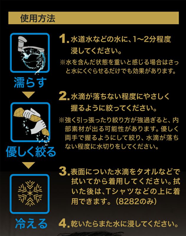 | 特徴 | 幅広い用途で活用でき、目が離せない素材。水と少しの風があればどこでも冷却可能! ◆冷却わた倍増!持続時間大幅UP! ◆ワーキングだけでなく、防災グッズとして新たな展開も期待できる次世代のクール素材を採用。 ◆水に浸して優しく絞る(拭く)だけで冷却し、長時間爽快に着こなせる。 ◆乾いたらまた水に浸すことで何度でも冷却効果を保ったまま使えるのでとても経済的。 ◆小さく折り畳めるので携帯も簡単。 ◆キルティングで特殊冷却わたをずれにくくし、クーラーネックは冷却機能を向上させたニューバージョン。 ◆ボディ部分の生地はストレッチ素材を採用し、動き易く着脱しやすい。 ◆持続時間は約10時間!(※使用状況や環境によって変わります) 【使用方法】 1.濡らす 水道水などの水に、1~2分程度浸してください。 水を含んだ状態を重いと感じる場合はさっと水にくぐらせるだけでも効果があります。 2.優しく絞る 水滴が落ちない程度にやさしく、握るように絞ってください。 強くひっぱたり絞り方が強すぎると、内部素材が出る可能性があります。 優しく両手で握るようにして絞り、水滴が落ちない程度に水切りをしてください。 3.冷える 表面についた水滴をタオルなどで拭いてから着用してください。拭いた後は、Tシャツなどの上に着用できます。 4.何度でも使える 乾いたらまた水に浸して使用してください。 |