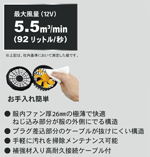 | 【特徴】 | 最大風量(12V)5.5m3/min(92リットル/秒) ※上記は、社内基準において測定した値です。 ◆お手入れ簡単 ◆服内ファン厚26mmの極薄で快適ねじ込み部分が服の外側にでる構造 ◆プラグ差込部分のケーブルが抜けにくい構造 ◆手軽に汚れを掃除メンテナンス可能 ◆補強材入り高耐久接続ケーブル付 【仕様】 ファン厚さ:39mm ファン直径:101mm ファン重さ:約85g 最大風量:5.5m3/min(92リットル/秒) 羽の枚数:7枚 ファン寿命:目安約3,000時間 OUTPUT 18V専用 |