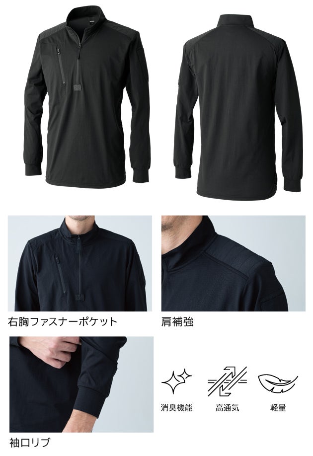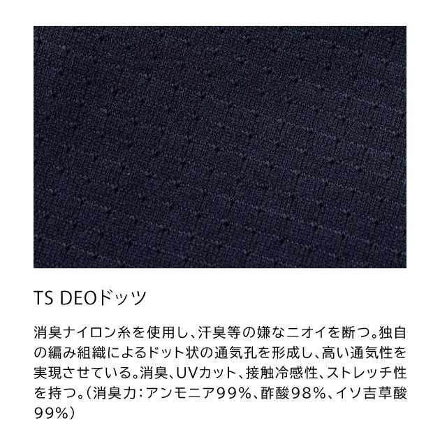 | 【特徴】 | 独自開発の消臭+超高通気素材を使用 汗臭等の嫌なニオイを断つ涼感ハーフジップシャツ ◆TS DEOドッツ 消臭ナイロン糸を使用し、汗臭等の嫌なニオイを断つ。 独自の編み組織によるドット状の通気孔を形成し、高い通気性を実現させている。 消臭、UVカット、接触冷感性、ストレッチ性を持つ。 (消臭力:アンモニア99%、酢酸98%、イソ吉草酸99%) ・消臭性 ・高通気性 ・ストレッチ性 ・肩補強 ・左袖ペン差し ・右胸ファスナーポケット ・袖口リブ |