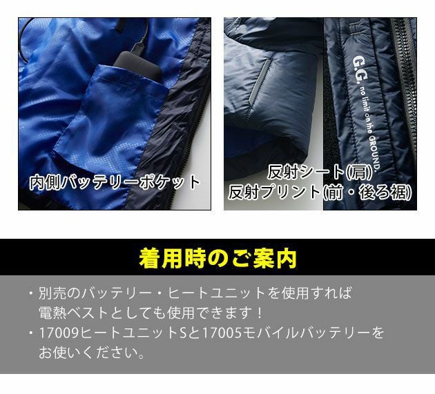 | 特徴 | 軽量感と滑らかな手触り。 高級感のある生地のフード付きおしゃれベスト。 ◆軽量なのにしっかり中綿が入っているからあったかい ◆右胸のマジックテープでワッペン取り付け可能 ◆電熱シート用ポケット付き(背中) ◆反射シート・反射プリント ◆胸ファスナーポケット ◆野帳が入る内ポケット ◆別売りの17009ヒートユニットSと17005モバイルバッテリーを使用することで電熱ベストとして使うこともできます! |