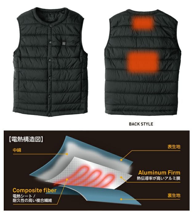 特徴 瞬間発熱!電熱シートに耐久複合繊維を使用したヒーター内蔵ベスト。