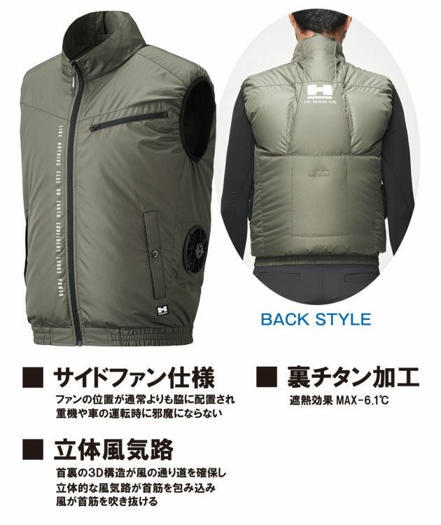 | 【特徴】 | ついにHUMMERから史上初の空調風神服が登場! マイナス6.1℃の遮熱性能! 夏の厳しい日差しから守る裏チタン加工を搭載! 座った時に背もたれに干渉しないサイドファン設計! ◆運転時に邪魔にならない!サイドファン仕様 ファンの位置が通常よりも脇に配置されているので、車の運転時や重機の運転時に邪魔にならない! 背もたれでファンがふさがれないので座っていても風をしっかり取り込めます! ◆首の裏から風が突き抜ける!立体風気路 首裏の3D構造が風の通り道を確保し、立体的な風気路を作り出します。 風が首筋を吹き抜け、より涼しい設計に! ◆左胸ファスナーポケット ◆保冷材ポケット ◆バッテリーケーブル・コードホール ◆両脇ポケット |