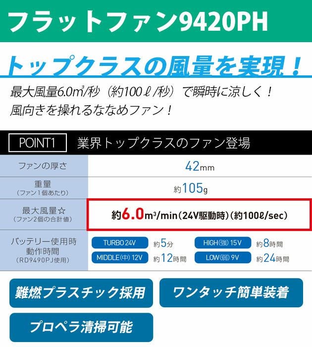 | ファン・バッテリー仕様 | コレさえ買えば悩む必要なし! 空調風神服2024年モデルファンバッテリーがついてくる! より長持ちするバッテリーと業界トップクラスの風量のファンで夏を快適に! ◆セット内容:バッテリー×1、充電アダプター×1、ファン×2、ファンケーブル×1 ▼バッテリーRD9490PJ▼ 強大なボルト数はそのままに。 さらにグレードアップして登場! バッテリーのセル数をパワーアップし、より長持ちするバッテリーに! ・新機能「ターボモード」! 24Vで最大風量100リットルを実現。(5分間) さらに「強」の場合は約8時間も連続稼働できます! ・アプリで操作できる! 空調風神服アプリを使えばスマホで風量を調節できます。 さらにアプリで1V単位で調整可能にグレードアップ! ・連続稼働時間 TURBOモード:約5分(24V) HIGH(強)モード:約8時間(15V) MIDDLE(中)モード:約12時間(12V) LOW(弱)モード:約24時間(9V) ※ターボモード使用後は自動的に通常モードに切り替わります ・バッテリー重量:約330g(5セル) ・Sマーク取得 ・充電所要時間約3.5時間 ・安心の日本製バッテリー ・難燃・簡易防水仕様 ・USBポート搭載 ・IN/OUTPUT一体型(ブルー) ▼フラットファンRD9420PH▼ 業界トップクラスの風量のファンが登場! ウェアから飛び出ないフラットファン! ・ファンの仕様 ファンの厚さ:42mm ファンの重量:約105g(1個) 最大風量:約6.0m3/min(24V駆動時) ・カバーを取り外して清掃可能(水洗い不可) ・ワンタッチで簡単装着 |