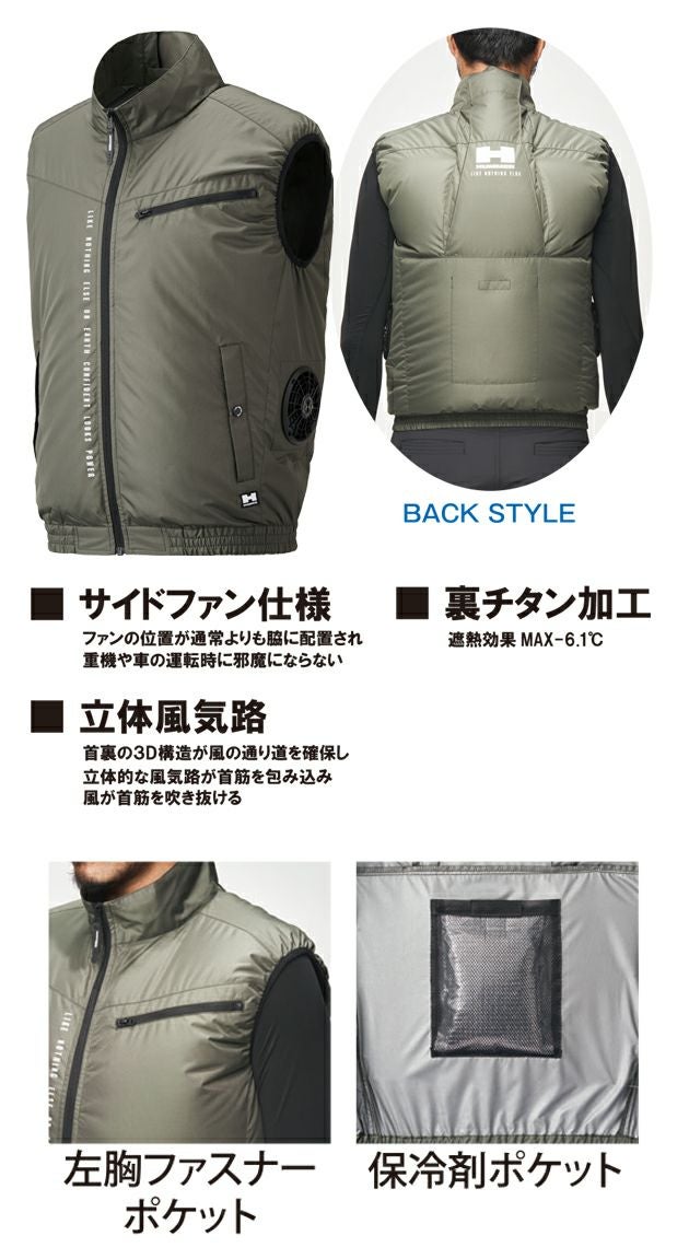 | 【特徴】 | つついにHUMMERから史上初の空調風神服が登場! マイナス6.1℃の遮熱性能! 夏の厳しい日差しから守る裏チタン加工を搭載! 座った時に背もたれに干渉しないサイドファン設計! ◆運転時に邪魔にならない!サイドファン仕様 ファンの位置が通常よりも脇に配置されているので、車の運転時や重機の運転時に邪魔にならない! 背もたれでファンがふさがれないので座っていても風をしっかり取り込めます! ◆首の裏から風が突き抜ける!立体風気路 首裏の3D構造が風の通り道を確保し、立体的な風気路を作り出します。 風が首筋を吹き抜け、より涼しい設計に! ◆左胸ファスナーポケット ◆保冷材ポケット ◆バッテリーケーブル・コードホール ◆両脇ポケット |