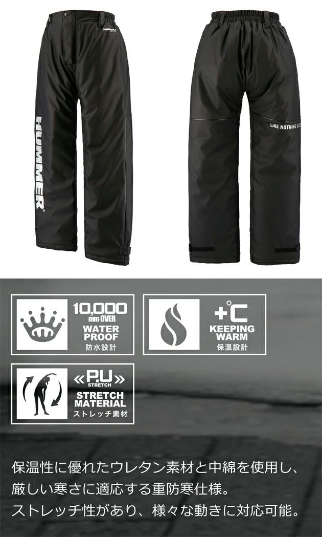 | 【特徴】 | 保温に優れるウレタン素材と中綿を使用し、厳しい寒さに適応する重防寒性能 ◆ストレッチ性に優れた軽量かつ肌触りの良いウレタン素材を使用し、さまざまな動きや体勢に対応 ◆耐水圧は10,000mmH2O以上で、冬場の冷たい雨や激しい雪にも適応 ・「HUMMER」をイメージしたプリントデザイン ・ウエストはゴム&ベルトループ仕様 ・裾口は調節可能なフラップテープ仕様 ・前開きファスナーパンツ |