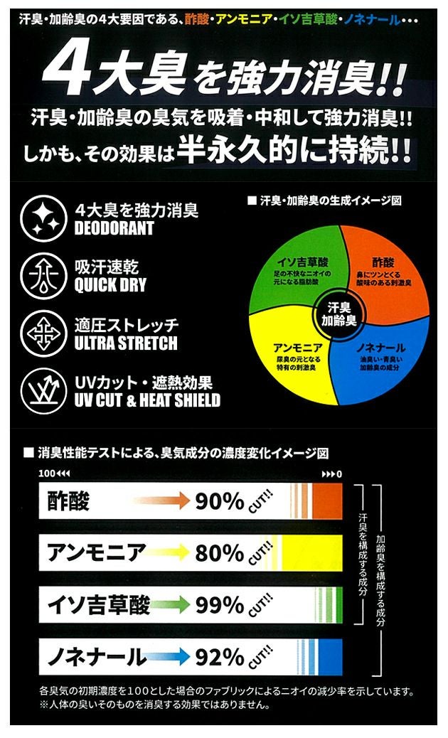 | 特徴 | 4大臭を強力消臭! 汗臭・加齢臭の臭気を吸着・中和して協力消臭! しかも、その効果は半永久的に持続します! ☆汗臭・加齢臭の4大要因である酢酸・アンモニア・イソ吉草酸・ノネナールを強力消臭! ◆消臭テストによる、臭気成分の濃度変化 酢酸(鼻にツンとくる酸味のある刺激臭) ⇒ 90%カット!! アンモニア(尿臭の元となる特有の刺激臭)⇒ 80%カット!! イソ吉草酸(足の不快なニオイの元になる脂肪酸)⇒ 99%カット!! ノネナール(油臭い・青臭いような加齢臭の成分)⇒ 92%カット!! ※人体の匂いそのものを消臭する効果ではありません。 ◆ストレッチ |