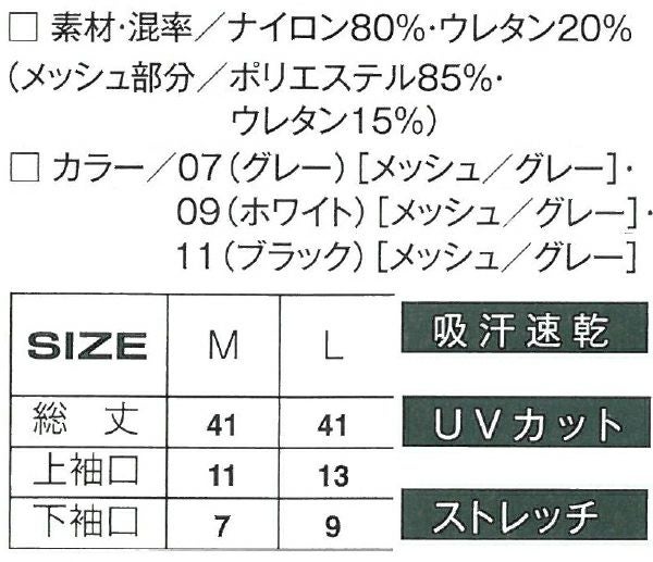 | 特徴 | 1、接触冷感 2、ストレッチ 3、UVカット 4、吸汗速乾 |