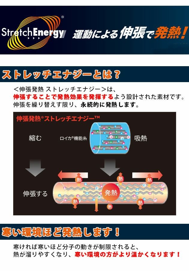 新しい発想!生地が伸び縮みすると発熱する「ストレッチエナジー」採用!
