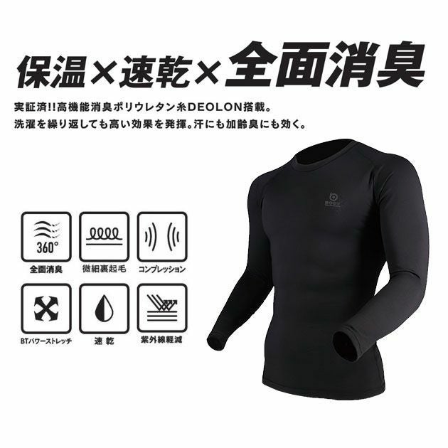 | 特徴 | 保温×速乾×全面消臭! あったかいだけじゃない! 高機能消臭糸DEOLONを全面に使用しているから汗や加齢臭もバッチリ消臭! ◆洗濯を繰り返しても高い消臭効果を発揮! 洗濯後であっても汗のにおいの原因に対して高い消臭機能を発揮していることを実証済みです。 ◆伸縮性とあったか裏起毛! 伸縮性の高い2WAYストレッチ生地は微細裏起毛タイプを採用! 肌触りが良く保温性に優れさらに速乾機能をプラス! ◆寒さから首元を守るハイネックタイプ ◆紫外線軽減 |