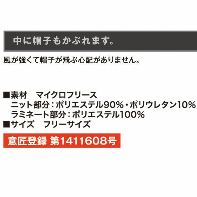 | 素材 | マイクロフリース、ニット部分:ポリエステル90%・ポリウレタン10%、ラミネート部分:ポリエステル100% |