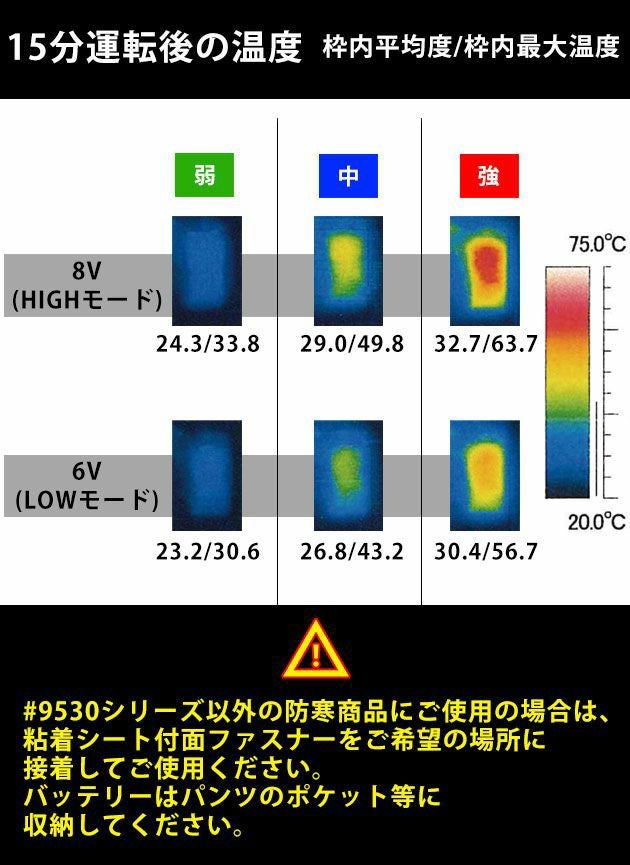 | △ご注意△ アイズフロンティア#9530シリーズ以外の防寒商品にご使用の場合は、 粘着シート付面ファスナーをご希望の場所に接着してご使用ください。 バッテリーはパンツのポケット等に収納してください。 |