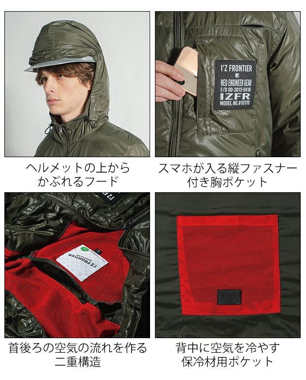 | 特徴 | アイズフロンティアが放つE.F.ウェアの新たなる世界観。 上質を極めたその質感は妥協を知らない物づくりの結晶。 ◆アイズフロンティアが表現するエレガント&リッチな世界観が、ワークシーンに異彩を放ちます。 ◆撥水機能も併せ持つ超軽量高密度ナイロン素材を使用。限界まで無駄をそぎ落としたシンプルなデザインに大胆なロゴプリントをプラス。 ◆重量感のあるダイキャスト製スピンドルストッパーや金属性ファスナー等、各資材にも拘り至高のリッチ感を演出。その世界感はワークシーンのみならず、様々なシーンに対応します。 ◆表面のシレ加工により高い密封性と適度な引裂き強度を併せ持ちエアロフロー効果を最大限に高めます。 ◆背面首ぐり部分の特許取得構造により、首もとからの安定した風の排出を実現。 ◆エレガントなルックスも、フルハーネス対応モデルでハードワーカー様にも対応可能 ◆ファスナーやドット釦等は国産YKK社製を使用。細部にまで品質に拘っています。 ・ヘルメットの上からかぶれるフード(視界広め) ・首後ろの立体構造で衣服内を風が駆け巡る ・スマホが入る縦ファスナー付き胸ポケット ・首後ろの空気の流れを作る二重構造 ・滑らかな質感で極上の着心地を実現 ・背中に空気を冷やす保冷材用ポケット ・ハーネス用フック掛け ・ファスナー付きランヤード取り付け口 ※AIRCYCLONESYSTEMご着用の際は、必ず専用のCOOLBLASTのファン・バッテリーをご使用ください。 |