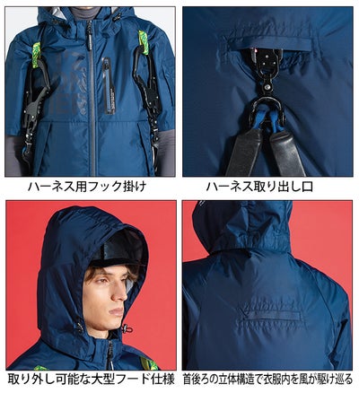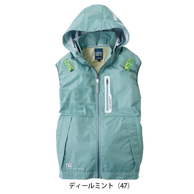 | 【特徴】 | アイズフロンティアが放つE.F.ウェアの新たなる世界観。 アクティブスポーツの軽快さとマインドをE.Fと交差させた、新たな次世代アクティブギアが誕生。 その上質なハイエナジーと品格を感じろ。 ◆ファンが背もたれに塞がれず、脇腹や衣服内の前後に効率よく風を届けられるサイドファン仕様。 ◆スポーツテイストのディテールを満載した、シーンを選ばないE.F.ウエア。 ◆前ファスナー/胸ポケットファスナーにはロゴ入りオリジナルスライダーを採用。 ◆胸ポケット周りには光沢ラバープリントを配置。 ◆胸ポケットファスナーは止水仕様。 ◆フードは取り外し可能なフルハーネス仕様。 ◆ロゴ入りハーネス対応テープは内側に収納できます。 ◆内ポケットはマチ付きファスナー仕様。 ◆脇ポケットは大容量の玉縁ポケット仕様。 ◆背面裏には面ファスナー付き保冷剤ポケットを搭載。 ◆衣服内の空気を循環させる立体特殊構造(首ぐり部分) ・フルハーネス対応。ハーネス用フック掛けとハーネス取り出し口を装備 ・取り外し可能な大型フード使用 ・サイドファン仕様 ・首後ろの立体構造で衣服内を風が駆け巡る ・首後ろの空気の流れを作る二重構造 ・高い遮熱性とUVカット率で衣服内温度上昇を抑える裏アルミコーティング ・背中に空気を冷やす保冷材用ポケット |
