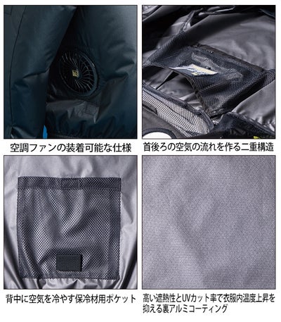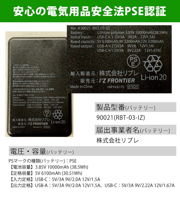 | 【特徴】 | A new chemistry sparked by fusion! 強風’と‘冷却’の鮮やかな融合が快適と言う名の未体験ゾーンを瞬時に創出。 待望のクロスオーバーハイテクノロジーモデルが満を持して登場! 猛暑時のワーカーに一条の安らぎを… ◆ペルチェデバイスとE.F.デバイスが融合したハイテクノロジーウエア。 ◆E.F.ファンからの出た風が効率よく衣服内を循環。また効率的に配置したメッシュから首廻りに向けて効率よく風が放出される特殊設計(特許出願中) ◆ペルチェデバイスは効率よく首を直接冷却することが可能です。 ◆ハーネス対応型としてアイコニックなロゴ入りイエローテープを肩口に使用。フロントにエンボスロゴテープを使用。大き目の脇ポケットがカジュアル感を演出します。 ◆生地裏側にはアルミコーティングを施し、衣服内の温度上昇を抑えます。 ※ウエア+#PS102ペルチェデバイス(2個)+#90021新型モバイルバッテリーのセットです。 ※E.F.デバイス(ファンセット・バッテリーセット)は別売りです。 【セット内容】 ・半袖ワークジャケット×1 ・ペルチェクールデバイス×1/取扱説明書兼保証書×1 ・バッテリー×1/充電用ケーブル(Type-A-Type-C)×1/取扱説明書×1 ※E.F.デバイス(ファンセット・バッテリーセット)は別売りです。 【セット販売同梱デバイス】 ◆#PS102 セットデバイスペルチェ(2個) 重量:約163g 使用電源:#90021モバイルバッテリー 温度切り替え:4段階 ※ペルチェデバイスの単品販売はございません ◆#90021 新型モバイルバッテリー 寸法:H17.5×W67×L104mm(本体) 重量:約165g(バッテリー1個) 届出事業者名(バッテリー):株式会社リブレ 製品型番(バッテリー):90021(RBT-03-IZ) PSマークの種類(バッテリー):PSE 【電池容量】3.85V 10000mAh (38.5Wh) 【定格容量】5V 6100mAh (30.51Wh) 【入力定格】USB-C:5V/3A 9V/2.0A 12V/1.5A 【出力定格】USB-A:5V/3A 9V/2.0A 12V/1.5A、USB-C:5V/3A 9V/2.22A 12V/1.67A ◆半袖ワークジャケット ・ハーネス用フック掛け ・2台のペルチェデバイスで環境温度から最大約20℃マイナスの冷却効果 ・首後ろの立体構造で衣服内を風が駆け巡る ・ファスナー付きハーネス取り出し口 ・首後ろの空気の流れを作る二重構造 ・高い遮熱性とUVカット率で衣服内温度上昇を抑える裏アルミコーティング ・背中に空気を冷やす保冷材用ポケット ・空調ファンの装着可能な仕様 |