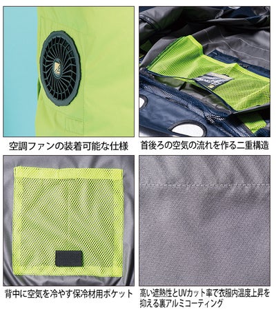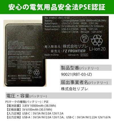 | 【特徴】 | A new chemistry sparked by fusion! 強風’と‘冷却’の鮮やかな融合が快適と言う名の未体験ゾーンを瞬時に創出。 待望のクロスオーバーハイテクノロジーモデルが満を持して登場! 猛暑時のワーカーに一条の安らぎを… ◆再帰反射素材を使用した、納入物件をターゲットにしたペルチェ+EFウエア。 ◆E.F.ファンからの出た風が効率よく衣服内を循環。また効率的に配置したメッシュから首廻りに向けて効率よく風が放出される特殊設計(特許出願中) ◆ペルチェデバイスは効率よく首を直接冷却することが可能です。 ◆ハーネス対応型としてアイコニックなロゴ入りイエローテープを肩口に使用。ベーシックなスタイルでありながらエンボスロゴテープがアイズらしさをさりげなく表現しております。 ◆生地裏側にはアルミコーティングを施し、衣服内の温度上昇を抑えます。 ※ウエア+#PS102ペルチェデバイス(2個)+#90021新型モバイルバッテリーのセットです。 ※E.F.デバイス(ファンセット・バッテリーセット)は別売りです。 【セット内容】 ・長袖ワークジャケット×1 ・ペルチェクールデバイス×1/取扱説明書兼保証書×1 ・バッテリー×1/充電用ケーブル(Type-A-Type-C)×1/取扱説明書×1 ※E.F.デバイス(ファンセット・バッテリーセット)は別売りです。 【セット販売同梱デバイス】 ◆#PS102 セットデバイスペルチェ(2個) 重量:約163g 使用電源:#90021モバイルバッテリー 温度切り替え:4段階 ※ペルチェデバイスの単品販売はございません ◆#90021 新型モバイルバッテリー 寸法:H17.5×W67×L104mm(本体) 重量:約165g(バッテリー1個) 届出事業者名(バッテリー):株式会社リブレ 製品型番(バッテリー):90021(RBT-03-IZ) PSマークの種類(バッテリー):PSE 【電池容量】3.85V 10000mAh (38.5Wh) 【定格容量】5V 6100mAh (30.51Wh) 【入力定格】USB-C:5V/3A 9V/2.0A 12V/1.5A 【出力定格】USB-A:5V/3A 9V/2.0A 12V/1.5A、USB-C:5V/3A 9V/2.22A 12V/1.67A ◆長袖ワークジャケット ・ハーネス用フック掛け ・2台のペルチェデバイスで環境温度から最大約20℃マイナスの冷却効果 ・首後ろの立体構造で衣服内を風が駆け巡る ・ファスナー付きハーネス取り出し口 ・首後ろの空気の流れを作る二重構造 ・高い遮熱性とUVカット率で衣服内温度上昇を抑える裏アルミコーティング ・背中に空気を冷やす保冷材用ポケット ・空調ファンの装着可能な仕様 |