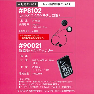 | 【ご注意】 | ●ウエア+#PS102ペルチェデバイス(2個)+#90021新型モバイルバッテリーのセットです。E.F.デバイス(ファンセット・バッテリーセット)は別売りです。 ●こちらのウェアはセット販売のみとなります。 ●AIR CYCLONE SYSTEMご着用の際は、必ず専用ファン・バッテリーをご使用ください。他社のファン・バッテリーを使用した際の事故や故障につきましては責任を負いかねます。 ※万が一赤みやかゆみ等、お肌に異常が発生した場合は直ちにご使用を中止ください。 |