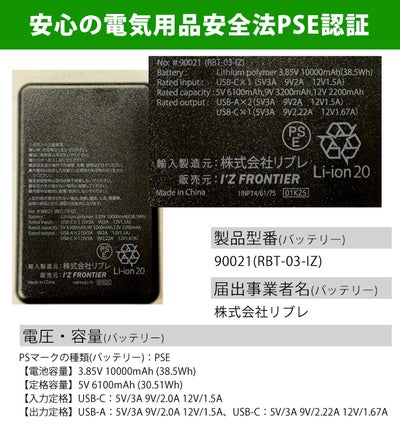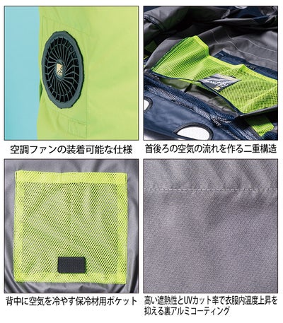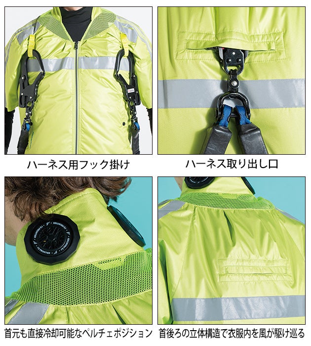| 【特徴】 | A new chemistry sparked by fusion! 強風’と‘冷却’の鮮やかな融合が快適と言う名の未体験ゾーンを瞬時に創出。 待望のクロスオーバーハイテクノロジーモデルが満を持して登場! 猛暑時のワーカーに一条の安らぎを… ◆再帰反射素材を使用した、納入物件をターゲットにしたペルチェ+EFウエア。 ◆E.F.ファンからの出た風が効率よく衣服内を循環。また効率的に配置したメッシュから首廻りに向けて効率よく風が放出される特殊設計(特許出願中) ◆ペルチェデバイスは効率よく首を直接冷却することが可能です。 ◆ハーネス対応型としてアイコニックなロゴ入りイエローテープを肩口に使用。ベーシックなスタイルでありながらエンボスロゴテープがアイズらしさをさりげなく表現しております。 ◆生地裏側にはアルミコーティングを施し、衣服内の温度上昇を抑えます。 ※ウエア+#PS102ペルチェデバイス(2個)+#90021新型モバイルバッテリーのセットです。 ※E.F.デバイス(ファンセット・バッテリーセット)は別売りです。 【セット内容】 ・半袖ワークジャケット×1 ・ペルチェクールデバイス×1/取扱説明書兼保証書×1 ・バッテリー×1/充電用ケーブル(Type-A-Type-C)×1/取扱説明書×1 ※E.F.デバイス(ファンセット・バッテリーセット)は別売りです。 【セット販売同梱デバイス】 ◆#PS102 セットデバイスペルチェ(2個) 重量:約163g 使用電源:#90021モバイルバッテリー 温度切り替え:4段階 ※ペルチェデバイスの単品販売はございません ◆#90021 新型モバイルバッテリー 寸法:H17.5×W67×L104mm(本体) 重量:約165g(バッテリー1個) 届出事業者名(バッテリー):株式会社リブレ 製品型番(バッテリー):90021(RBT-03-IZ) PSマークの種類(バッテリー):PSE 【電池容量】3.85V 10000mAh (38.5Wh) 【定格容量】5V 6100mAh (30.51Wh) 【入力定格】USB-C:5V/3A 9V/2.0A 12V/1.5A 【出力定格】USB-A:5V/3A 9V/2.0A 12V/1.5A、USB-C:5V/3A 9V/2.22A 12V/1.67A ◆半袖ワークジャケット ・ハーネス用フック掛け ・2台のペルチェデバイスで環境温度から最大約20℃マイナスの冷却効果 ・首後ろの立体構造で衣服内を風が駆け巡る ・ファスナー付きハーネス取り出し口 ・首後ろの空気の流れを作る二重構造 ・高い遮熱性とUVカット率で衣服内温度上昇を抑える裏アルミコーティング ・背中に空気を冷やす保冷材用ポケット ・空調ファンの装着可能な仕様 |