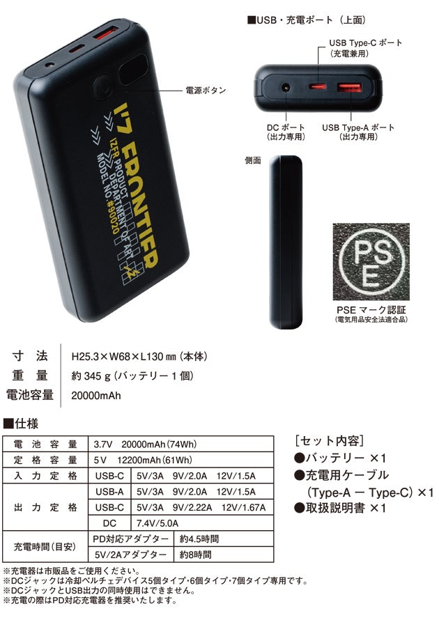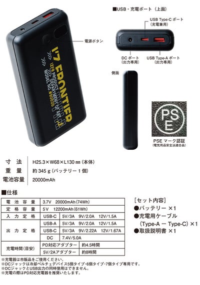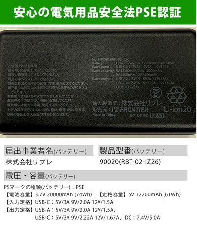 | 【特徴】 | PSEマーク認証(電気用品安全法適合品) 寸法:H25.3×W68×L130mm(本体) 重量:約345g(バッテリー1個) 電池容量:20000mAh 【セット内容】 ・バッテリー×1 ・充電用ケーブル(Type-A-Type-C)×1 ・取扱説明書×1 届出事業者名(バッテリー):株式会社リブレ 製品型番(バッテリー):90020(RBT-02-IZ26) PSマークの種類(バッテリー):PSE 【電池容量】3.7V 20000mAh (74Wh) 【定格容量】5V 12200mAh (61Wh) 【入力定格】USB-C:5V/3A 9V/2.0A 12V/1.5A 【出力定格】USB-A:5V/3A 9V/2.0A 12V/1.5A、USB-C:5V/3A 9V/2.22A 12V/1.67A、DC:7.4V/5.0A 【充電時間(目安)】 PD対応アダプター:約4.5時間 5V/2Aアダプター:約8時間 ※充電器は市販品をご使用ください。 ※DCジャックは冷却ペルチェデバイス5個タイプ・6個タイプ・7個タイプ専用です。 ※DCジャックとUSB出力の同時使用はできません。 ※充電の際はPD対応充電器を推奨いたします。 |