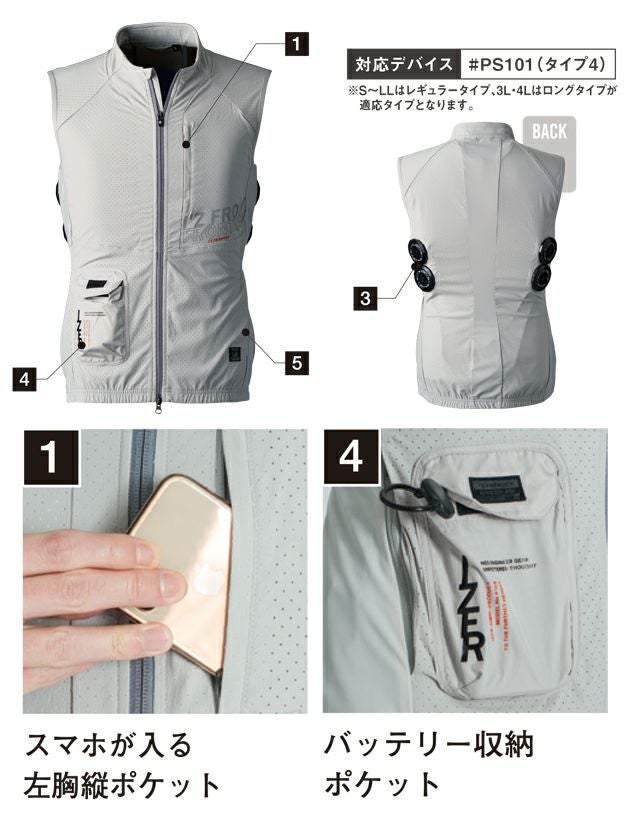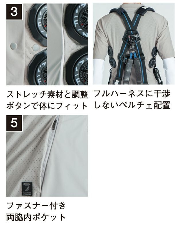| 【特徴】 | 例えるなら氷を纏う。 過酷な夏を快適にできる新たなる可能性「冷却ペルチェ」システム対応のジャケット登場! ◆ペルチェデバイスを装着!マイナス22度のハイレベルな冷却性能! 背面両脇の4か所に直径5センチの別売ペルチェデバイスが装着可能な冷却ウェア。 デバイス接触部分は電源を入れて約10秒でマイナス22℃まで冷却! 脇部分の動脈を冷やすことで効果的に体全体をクールダウンさせる。 ◆業界トップクラスの通気性を実現する無数の通気孔で真夏のワークシーンを快適に ◆強靭なナイロン糸を使用し、引裂き強度のアップを実現 ◆ハイレベルなストレッチ性でストレスフリーな着心地を実現 ◆高級感を演出するフルダルナイロン素材を採用し、シルバーグレーの透け防止効果を発揮 ◆脇・背中中心にはさらにストレッチ性に優れた素材を採用 ◆ナイロン生地特有の強さと速乾性も併せ持つ ◆ペルチェデバイスは簡単に取り外しができ、洗濯もいつも通りできます ◆ワークのみならず夏場のライダースやサイクリングウェアとしても着こなせるデザイン ◆フルハーネスに干渉しないペルチェ配置 ◆スマホが入る左胸縦ポケット ◆ストレッチ素材と調整ボタンで体にフィット ◆ファスナー付き両脇内ポケット ◆バッテリー収納ポケット |