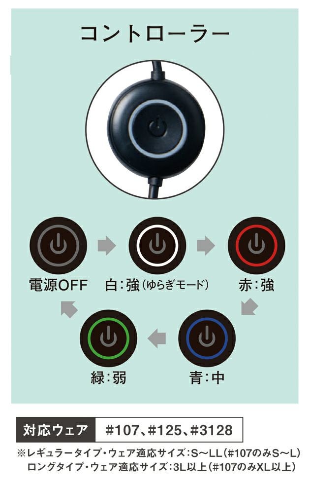 | 【特徴】 | 例えるなら氷を纏う。 過酷な夏を快適にできる新たなる可能性「冷却ペルチェ」デバイス登場! こちらはペルチェが3つついている「タイプ3」です。 ◆銀色の接触部分は電源を入れて約10秒でマイナス22度まで冷却 ◆動脈を冷やすことで効果的に体全体をクールダウン! ◆長時間使用による体の慣れから危惧される冷感麻痺を回避するためにゆらぎモード(10分稼働し2分オフの繰り返し)を搭載 ◆デバイス取り付け用キャップは落下しにくい新構造にバージョンアップ ◆コンプレッションとのコーディネートでさらなる冷感アップも ◆寸法:H21×W17.5×D4.5mm(箱) ◆重量:約310g ◆電源:5V(2.2A以上)モバイルバッテリー ◆セット内容:クールデバイス×1・取り扱い説明書兼保証書×1 ◆温度切り替えモード ・強(白・ゆらぎモード):最大約マイナス22℃・約4時間 ・強(赤):最大約マイナス22℃・約3.5時間 ・中(青):最大約マイナス18℃・約4.5時間 ・弱(緑):最大約マイナス13℃・約6時間 ※ケーブルの長さがレギュラータイプとロングタイプで異なります。 ・レギュラータイプ対応サイズ:S~LLまで(107のみS~L) ・ロングタイプ対応サイズ:3L以上(107のみXL以上) |