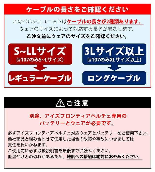 | 【ご使用時のご注意】 | この商品はペルチェデバイス単体です。 別途バッテリーとウェアが必要です。 低温やけどになりますので地肌への直接着用はおやめください。 取扱説明書をお読みいただき正しくご使用ください。 |