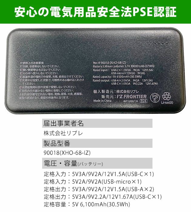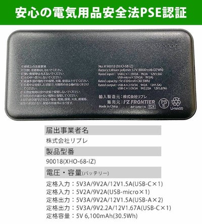 | 入出力(バッテリー):定格入力:5V3A/9V2A/12V1.5A(USB-C×1) 定格入力:5V2A/9V2A(USB-micro×1) 定格出力:5V3A/9V2A/12V1.5A(USB-A×2) 定格出力:5V3A/9V2.2A/12V1.67A(USB-C×1) |
