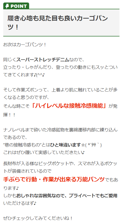 | 特徴 | アイズフロンティアのこだわりを結集したスーパーストレッチクーウェア登場! ◆ナノレベルまで砕いた冷感鉱物を裏綿遷移内部に練り込み、ハイレベルな接触冷感機能を実現! ◆肌綿遷移の特殊構造により、汗を素早く吸収拡散! ◆従来のデニム素材に比べて快適性がアップする吸水速乾機能。 ◆伸長率40%(横方向)を誇る驚異のスーパーストレッチ。 ◆紫外線遮断率97%を誇るセラミック織り込み繊維を使用! ◆特殊な洗い加工で、ワイルド・気品あふれる表情に! ◆3Dカッティングによる抜群の動きやすさ! ◆ジャケット ・スタイルにもこだわったペンポケット ・スマホが入る左胸内ポケット付き ◆カーゴパンツ ・2重構造で長財布も入る右側ビッグポケット ・左ポケットはスマホ収納可能 ・3Dカッティングによる抜群の動きやすさ |