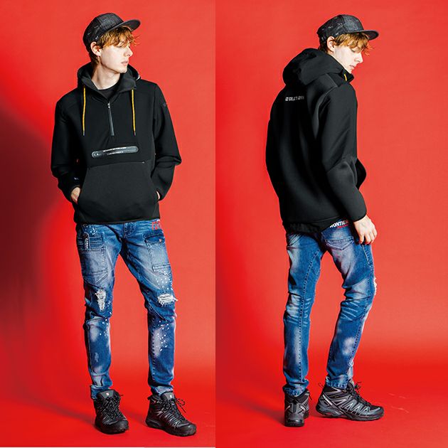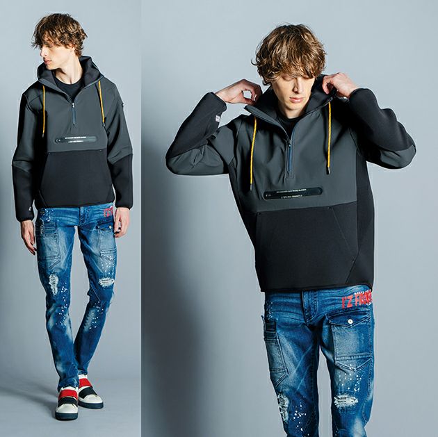 | 【特徴】 | Let's enjoy winter! 冬の街をアクティブにきめろ!様々なシーンに映える行動派ワーカーご用達のストリートアイテム鮮烈デビュー。 ◆布帛、カットソー、ボアなど、あらゆる素材をミックスし、強烈なストリートカジュアルテイストを放つ最高峰アウターアイテム。 ◆本体素材はアクティブ感の高いストレッチダンボールニットを使用。3シーズン対応のしなやかな生地に抜群のストレッチ性(伸長率タテ約31%ヨコ約23%伸長回復率タテ約95%ヨコ約99%)をプラス。 ◆素材の中に空気の層が生まれるダンボール構造により快適な保温性を実現。 ◆動き易さのみならず、抗ピリング性能5級、抗スナッグ性能4.5級、破裂強さ1000以上を誇るハードワークにも対応可能な高強度モデル。 ◆フードや前身上部、腕上部それぞれに防風性を兼ね備えた布帛素材を使用。このハイブリット構造により機能性と高級感をアップ。 ◆フードラバープリントやシームテープ付きファスナーポケット、特殊加工のフロントファスナー、個性的なフードロープ、ブランドロゴ入りアイレット、圧着カン止めテープ等様々なデコレーションを配し細部にまで拘りを追求。スポーティーで高級感溢れるルックスに仕上げています。 ・首にフィットする絶妙なフード設計 ・スタイリッシュな左袖ペンポケット ・ファスナー付きフロントポケット ・フロントマフポケット |