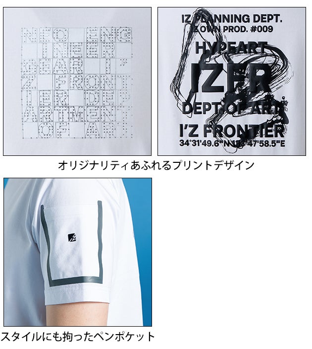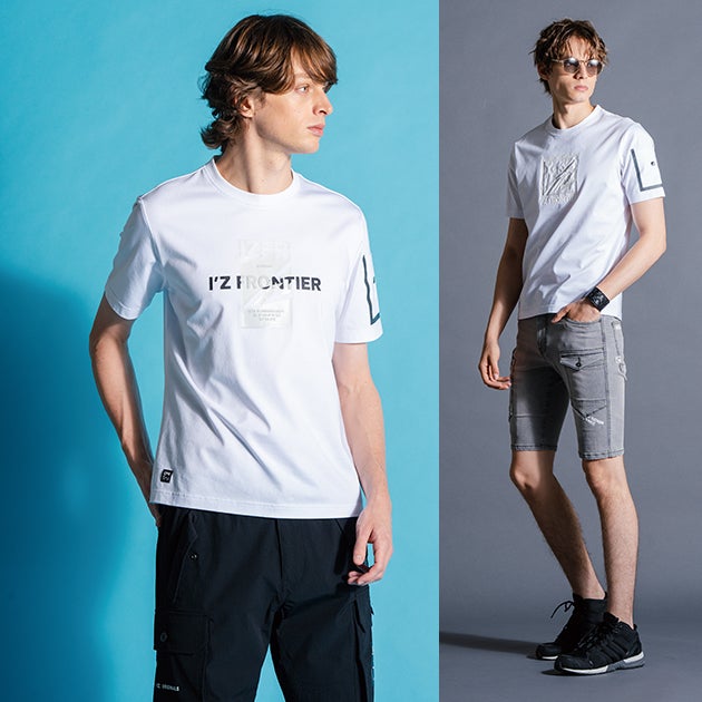 | 【特徴】 | SUSTAINABLE×TECHNOLOGY×ARTSTIC EXPRESSION ワークシーンに確固たる領域を確立したユーティリティーウェアが鮮烈なインバクトを纏って降臨。 至極のTriple Force をFeel it for yourself ! ◆植物由来の環境に配慮したサスティナブル素材 Sorona(R)を採用した着心地抜群のTシャツ。 ◆Sorona(R)の原料に鉱石を練り込むことで、q-max値0.32の接触冷感機能をプラスしました。 ◆表面がコットン、裏面が冷感Sorona(R)のダブルフェイスに編み立てることで、カジュアルなルックスと柔らかな風合い、裏面のサラッとひんやりした肌触りで快適な着心地を得られます。 ◆Sorona(R)繊維自体が持つ弾力性と復元力で心地よいストレッチ性を発揮し、さらに高い耐摩耗性も備えます。 ◆左袖ポケットはシームテープ仕様でデザイン性UP。 ◆個性豊かなプリントや刺繍(エンボス+高周波立体プリント、立体エンボス+転写プリント、ライチ発泡プリント、ラバープリント+発泡プリント、光沢転写プリント、立体刺繍、金箔+ラメプリント、銀箔+ラメプリント、ラバープリント+スエード調発泡プリント)を多彩に展開。 さらに存在感抜群の総柄(85番色)もラインナップ。 お好みに合わせてチョイスできます。 ・左袖ペンポケット |