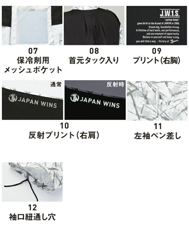 | 特徴 | プリント柄が存在感際立つフルハーネス対応の空調服! 収納可能なフックハンガーや個性的なプリント柄とJawinロゴが特長の空調服。 ◆フルハーネス安全帯着用者専用の空調服です。 背中部分からランヤードを取り出すことができます。 ◆Dカン収納ポケット付き フルハーネス未着用時はDカンを収納することができます。 ◆調整紐(首元) ◆左内側バッテリー専用ポケット ◆ランヤードフックかけDカン ◆ランヤード取付口 ◆ファン脱落防止用メッシュ ◆保冷剤用メッシュポケット ◆首元タック入り ◆プリント(右胸) ◆反射プリント(右肩) ◆左ペン差し ◆袖口紐通し穴 |