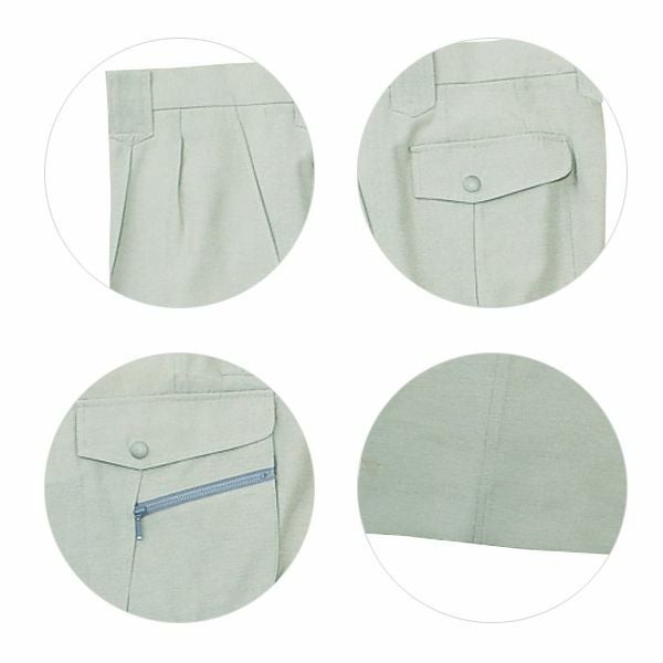 1、両孫ポケット・右ペン差付カーゴポケット 2、帯電防止素材使用 3、清凉機能素材 4、Jichodo WING ARM 5、エアパス |