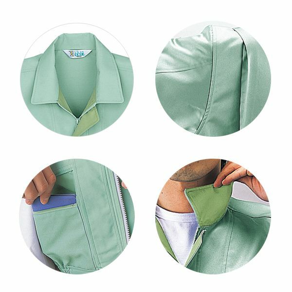 1、ワンポイント 2、衿裏デザイン配色 3、ノーフォーク 4、内ポケット 5、袖口裏デザイン配色 6、帯電防止素材使用 7、低発塵 8、抗菌防臭加工 9、帯電防止JIS規格合格商品 10、低発塵素材リバーセル 11、CLEANDESK 12、清浄度クラス1000 13、ペアコーディネート |