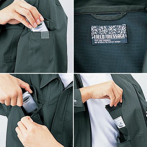 1、背ネーム 2、背当てメッシュ 3、ワンポイント 4、左袖機能ポケット(ペン差付) 5、携帯電話収納ポケット 6、内ポケット 7、オリジナルデザインボタン 8、アクションプリーツ(メッシュ) 9、肘タック 10、帯電防止素材使用 |