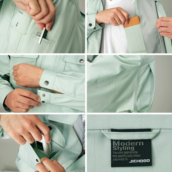 1、背ネーム 2、携帯電話収納ポケット 3、アクションプリーツ(メッシュ) 4、袖口アジャスター 5、オリジナルデザインボタン 6、肘タック 7、内ポケット 8、左袖ペン差し 9、帯電防止素材使用 |