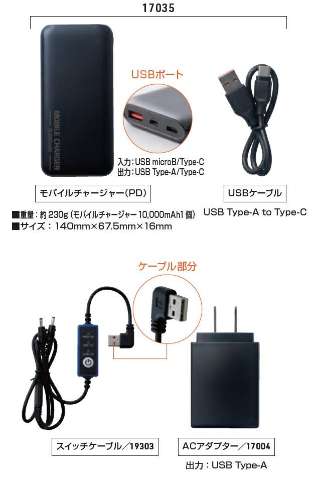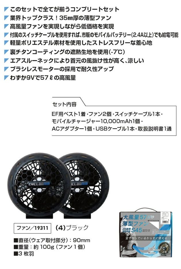 | 【セット内容】 | EF用ベスト1着・ファン2個・スイッチケーブル1本・モバイルチャージャー10,000mAh 1個・USBケーブル1本・ACアダプター1個・取扱説明書1通 |