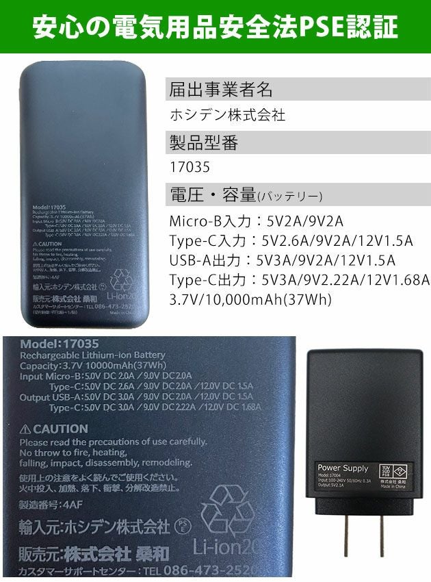 | 入出力(バッテリー):Micro-B入力:5V2A/9V2A Type-C入力:5V2.6A/9V2A/12V1.5A USB-A出力:5V3A/9V2A/12V1.5A Type-C出力:5V3A/9V2.22A/12V1.68A |