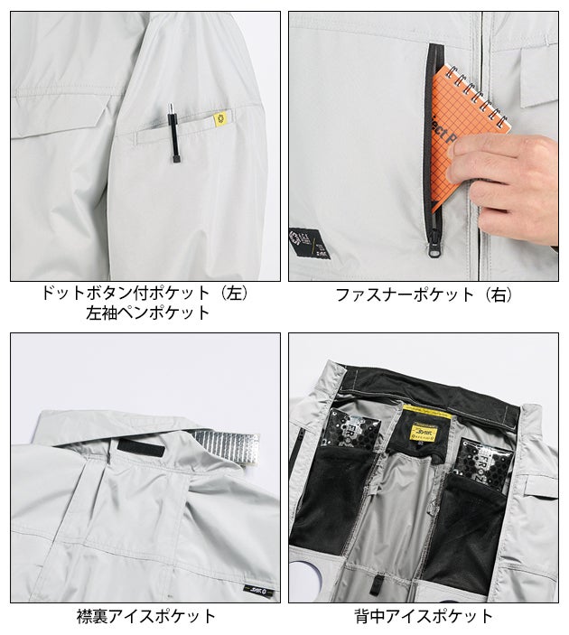 【特徴】 ファン付ウェアに欠かせない遮熱・UVカットに加え、軽さも兼ね揃えた裏チタン素材をベースに機能面を重視し、実用性高めたデザインにまとめたワークスタンダード