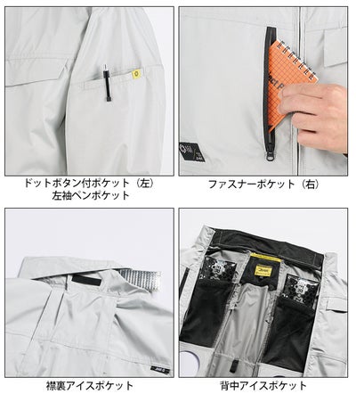 【特徴】 ファン付ウェアに欠かせない遮熱・UVカットに加え、軽さも兼ね揃えた裏チタン素材をベースに機能面を重視し、実用性高めたデザインにまとめたワークスタンダード