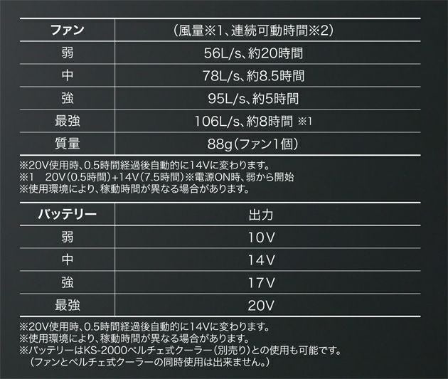 | 【特徴】 | 丸洗い防水栓をつける事により丸洗い可能に!洗えるファン!新登場 20Vで、秒速106Lの特大風量が実現。 【セット内容】 ファン(KS-253)…2個 二股ケーブル…1本、 充電式リチウムイオンバッテリー…1個、 ACアダプター急速充電器…1個 丸洗い防水栓 取扱説明書兼保証書…1冊 【ファン(風量※1、連続可動時間※2)】 弱:56L/s、約20時間 中:78L/s、約8.5時間 強:95L/s、約5時間 最強:106L/s、約8時間※1 質量:88g(ファン1個) 20V使用時、0.5時間経過後自動的に14Vに変わります。 120V(0.5時間)+14V(7.5時間)電源ON時、弱から開始 ※使用環境により、稼動時間が異なる場合があります。 【バッテリー(出力)】 弱:10V 中:14V 強:17V 最強:20V ※20V使用時、0.5時間経過後自動的に14Vに変わります。 ※使用環境により、稼動時間が異なる場合があります。 ※バッテリーはKS-2000ペルチェ式クーラー(別売り)との使用も可能です。 (ファンとペルチェ式クーラーの同時使用は出来ません。) 定格容量:充電式リチウムイオン電池 DC18.5V/3350mAh/61.97Wh 定格入力:DC21V/1500mA 外形寸法:W:75mmH:115mmD:27mm 質量:319g 充電時間:約3.5時間 風量調整機能:押しボタン式4段階 充電回数:約500回 ※クロダルマ標準バッテリー仕様で測定した値です(標準測定温度25度)ご使用時の目安としてください。 ※当社標準バッテリーをフル充電時の値です。使用環境により、稼動時間が異なる場合があります。 【バッテリー】 届出事業者名(バッテリー):豊鷹(株) 製品型番(バッテリー):KS-254 PSマークの種類(バッテリー):PSE 入出力(バッテリー):入力:21V/1.5A・出力:ポート1:20V/17V/14V/10Vポート2:5V/4.3V/3.8V/3.3V バッテリー容量:3,350mAh/18.5V(61.97Wh) 【ACアダプター】 ACアダプター型番:KS-206(SW-210120) PSマークの種類(ACアダプター):PSE 登録検査機関名(ACアダプター):テュフ・ラインランド・ジャパン株式会社 |