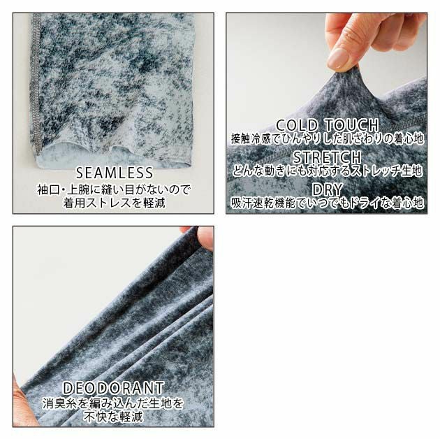 | 特徴 | 優れた吸水速乾性、ストレッチ性、消臭生で快適性をUP。 ヒンヤリとした肌触りの着心地で夏に最適なインナーウェアです! 縫い目が無いからラインが目立たず快適な着心地を実現。 消臭系を編み込んだ生地と汗臭が気になる脇部分に消臭テープを使用。 ◆接触冷感でひんやりとした肌触りの着心地 ◆どんな動きも対応するストレッチ生地 ◆吸汗速乾機能でいつまでもドライな着心地 ◆消臭糸を編み込んだ生地が不快な臭いを軽減 ◆袖口・上腕に縫い目が無いので着圧ストレスを軽減 |
