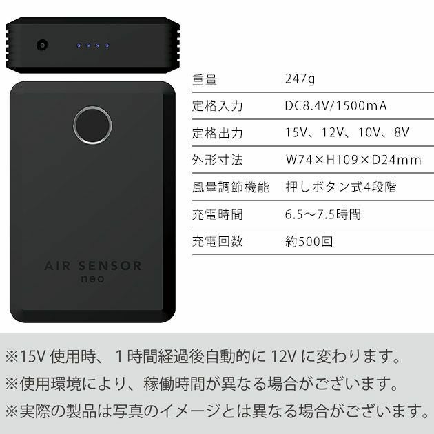 | 特徴 | 必要なものを見極めて、不要なものを削ったら、残ったものがneoでした。 シンプルかつハイパワーなエアセンサーワンデバイスフルセット登場! ◆ファンは86リットル/秒の特大風量! ◆ハイパワーかつ、省エネモーターを採用し、ファンの動作時間を向上 ◆シンプルで洗練されたデザイン ◆バッテリーのスイッチボタンは直径1.7cmの押しやすいボタン ◆手に持った時に滑りにくい滑り止め付き ◆ファン仕様 ・重量:184g(ファン2個) ・風量:最強(86リットル)・強(70リットル)・中(60リットル)・弱(48リットル) ・動作時間:最強(4時間)・強(5時間)・中(8時間)・弱(13時間) ※最強での使用時は1時間経過後自動的に強に切り替わります。 ◆バッテリー仕様 ・重量:247g ・定格入力:DC8.4V/1500mA ・定格出力:15V・12V・10V・8V ・外形寸法:W74×H109×D24mm ・充電時間:6.5~7.5時間 ・充電回数:約500回 ◆セット内容 ファン×2、ケーブル×1、リチウムイオンバッテリー×1、専用充電器×1、取扱説明書県保証書変えkル1、コンセプトカード×1 |