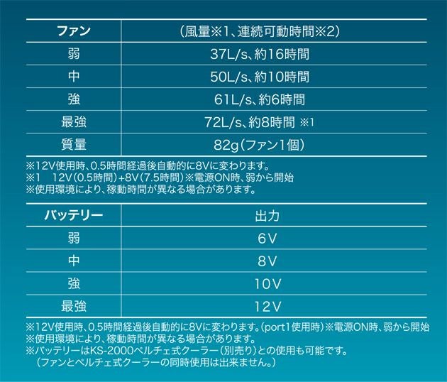 | 【特徴】 | ファン付きウェアをまだ使ったことがない人へ 初めてのファン付きウェアにおすすめ!小型軽量バッテリーで携帯性抜群。最大16時間の長時間稼働。 ファンの音がうるさくない静音性。 多機能でありながら、リーズナブルな価格でお買い求め頂ける商品です。 ファン付きウェアがあれば服の中を風が吹き抜け、様々なシーンを快適に過ごせます。 【内容】 ・ファン2個 ・ファン接続用二股ケーブル1本 ・充電式バッテリー1個 ・ACアダプター充電器1個 ・取扱説明書兼保証書1冊 【ファン風量/連続可動時間】 弱:537L/s、約16時間 中:50L/s、約10時間 強:61L/s、約6時間 最強:2L/s、約8時間※1 質量:82g(ファン1個) ※12V使用時、0.5時間経過後自動的に8Vに変わります。 ※112V(0.5時間)+8V(7.5時間)※電源ON時、弱から開始 ※使用環境により、稼動時間が異なる場合があります。 【バッテリー出力】 弱:6V 中:8V 強:10V 最強:12V ※12V使用時、0.5時間経過後自動的に8Vに変わります。(port1使用時)電源ON時、弱から開始 ※使用環境により、稼動時間が異なる場合があります。 ※バッテリーはKS-2000ペルチェ式クーラー(別売り)との使用も可能です。 (ファンとペルチェ式クーラーの同時使用は出来ません。) 定格容量:充電式リチウムイオン電池 DDC7,26V/3350mAh/24.32Wh 定格入力:DC8.4V/1500mA 外形寸法:W:60mmH:100mmD:22mm 質量:130g 充電時間:約3.5時間 風量調整機能:押しボタン式4段階 充電回数:約500回 ※当社標準バッテリー仕様で測定した値です(標準測定温度25℃)ご使用時の目安としてください ※当社標準バッテリーをフル充電時の値です。使用環境により、稼働時間が異なる場合があります。 |