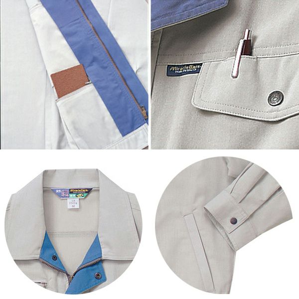 1、右胸Wポケット 2、左胸ペン差し 3、左袖ペン差し 4、左内ポケット 5、永続する防縮性 6、永続する防皺性 7、優れた柔軟性 8、優れた速乾性 9、優れた保型性 10、麻混+強撚CVC 11、形状記憶加工 12、制電素材 13、 |