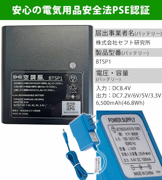 | 特徴 | 長時間、長期間着用される方にオススメ ■内容:FAN2200K/G(空調服ワンタッチファン)、BTSP1(空調服パワーファン対応バッテリー)、RD9261(空調服ケーブル)、LISPCASE(BTSP1用バッテリーケース)、LIACR(急速AC充電アダプター ◆赤色LEDを採用し、屋外での視認性が向上しました。 ◆JIS IP55(防塵防水)規格適合。※水没等の水の侵入による故障を保証するものではありません。 ◆ワンボタンで簡単操作。 ◆9段階でのバッテリー残量表示機能付き。 <ファン> ◆仕様 ・外寸:厚さ47mm(最大値) ・重量:103(1個) ・動作寿命:2000時間(公称値) ◆最大風量 ・7.2V:48.8L/秒 ・6.0V:42.2L/秒 ・5.0V:36.8L/秒 ・3.3V:25.8L/秒 <バッテリー> ◆仕様 ・外寸:W85mm・D25mm・H89mm ・出力:7.2V、6V、5V、3.3V(4段階) ・放電温度:0~50度 ・充電時間:約8時間(LIACR使用の場合) ・定格容量:6500mAh(46.8Wh) ・充電可能温度:0~40度 ・保存温度:-20度~50度(20~30度推奨) ・重量:274g ◆対応ファン ・FAN2200K/G/R、FAN2400SPBB ◆連続使用時間(FAN2200使用時) ・7.2V設定時:約8時間 ・6.0V設定時:約12時間 ・5.0V設定時:約18時間 ・3.3V設定時:24時間以上 △△ご注意ください△△ 6V、7.2Vでご使用になる場合、ファンの動作寿命は低下してしまいます。 高温多湿の場所など、どうしても5V以上の風量が必要な場合にのみお使いください。 |