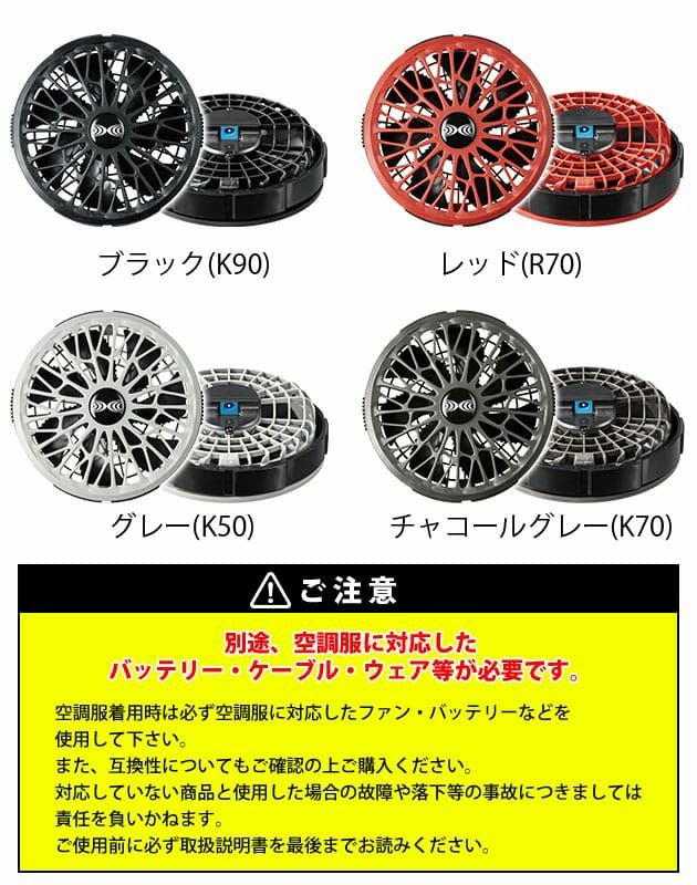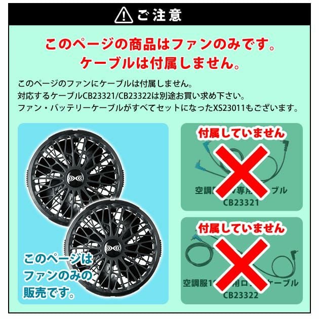 | ご使用時の注意 | このファンは空調服14.4V専用のファンです。 対応するバッテリーはBT23231のみです。 また、ケーブルも付属していません。 対応するケーブルはCB23321・CB23322です。 既存品との互換性はありませんのでご注意ください。 付属の取扱説明書をお読みいただき正しくご使用ください。 この商品は (株)セフト研究所・(株)空調服の特許及び技術を使用しています。 「空調服(R)」は(株)セフト研究所・(株)空調服のファン付きウェア、その附属品、及びこれらを示すブランドです。 「空調服(R)」、「DC空調服」ロゴは、(株)セフト研究所・(株)空調服の登録商標です。 |