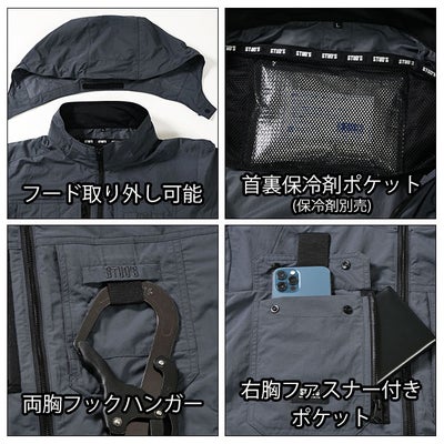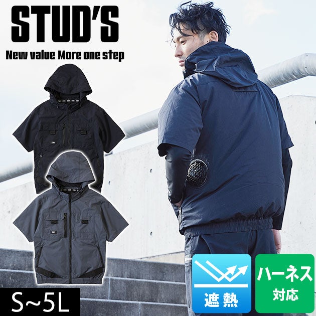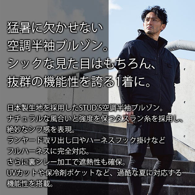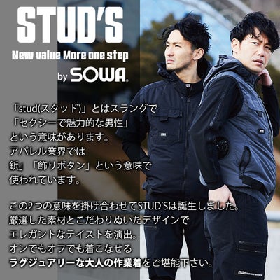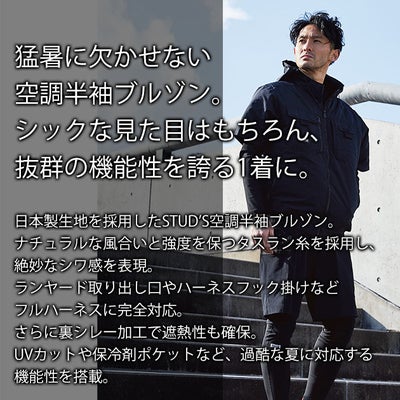 | 【特徴】 | 「STUD'S(スタッズ)」。 それは「大人の作業着」。 ラグジュアリーな作業服ブランド「STUD'S」から空調作業服が登場! シックな見た目はもちろん、抜群の機能性を誇る1着に仕上がりました! ◆日本製生地使用 ◆ナチュラルな風合いと強度を保つタスラン糸 ◆絶妙なシワ加工 ◆裏シレー加工で遮熱性を確保 ◆UVカット ◆衿裏接触冷感 ◆フルハーネス対応 ◆フード取り外し可能 ◆保冷剤ポケット |