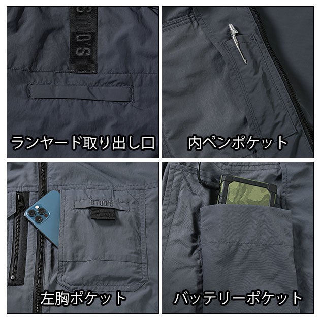 | 【特徴】 | 「STUD'S(スタッズ)」。 それは「大人の作業着」。 ラグジュアリーな作業服ブランド「STUD'S」から空調作業服が登場! シックな見た目はもちろん、抜群の機能性を誇る1着に仕上がりました! ◆日本製生地使用 ◆ナチュラルな風合いと強度を保つタスラン糸 ◆絶妙なシワ加工 ◆裏シレー加工で遮熱性を確保 ◆UVカット ◆衿裏接触冷感 ◆フルハーネス対応 ◆フード取り外し可能 ◆保冷剤ポケット |